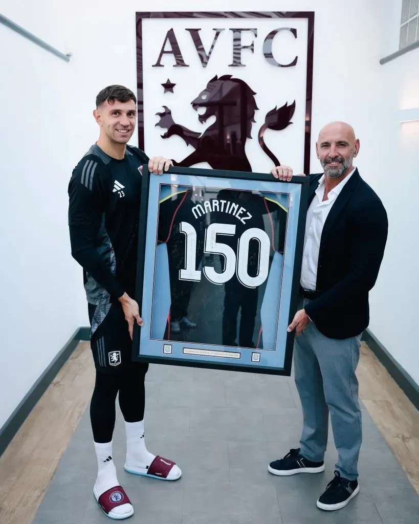Sin embargo, otro es el hito que lo lleva a ser homenajeado por el club, y es que este sábado alcanzará los 150 partidos como villano. Ante esto, el Aston Villa le otorgó una placa especial: una remera enmarcada con el número de encuentros disputados por Dibu Martínez en el club.