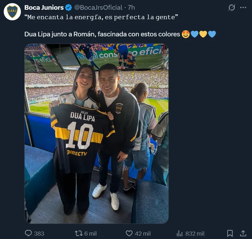Tras el partido, que Boca ganó por 2 a 0, Juan Román Riquelme se acercó al palco de Dua Lipa y le regaló una camiseta del club con el número 10 y su nombre. La imagen fue compartida en las redes sociales del club, desatando la euforia de los hinchas.