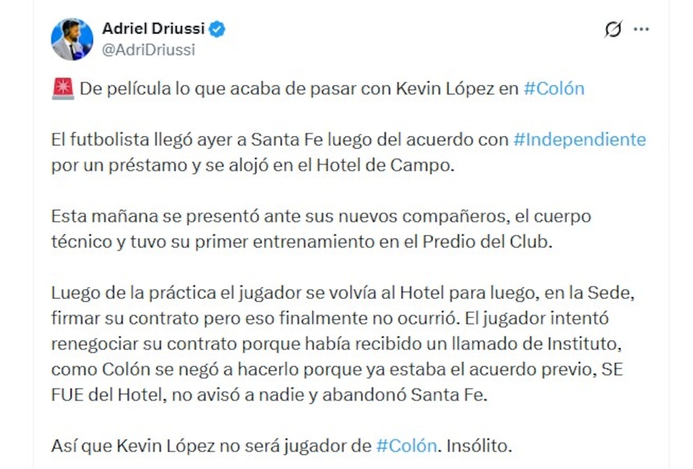 El suceso sorprendió a la dirigencia de Colón, ya que el jugador había llegado el domingo y se había hospedado en el Hotel de Campo del club. Tras entrenar el lunes y ser presentado ante el cuerpo técnico y sus nuevos compañeros, el panorama cambió abruptamente. López decidió no avisar y abandonó Santa Fe tras recibir un llamado de Instituto, que le solicitó renegociar el contrato.