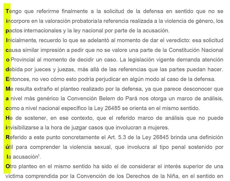 Las primeras letras de 17 renglones consecutivos de la página 41 conformaban un mensaje oculto de tres palabras. Al unir en vertical las letras de una sentencia en la que se declara responsable de abuso sexual agravado por acceso carnal a un hombre en las inmediaciones de Zapala, provincia de Neuquén, se leía una reflexión dirigida al abogado Pablo Méndez, defensor oficial del acusado. “Típico de machirulo” es la frase del acróstico que se esconde sobre el borde izquierdo del escrito y que realizó a conciencia la jueza de garantías Leticia Lorenzo.